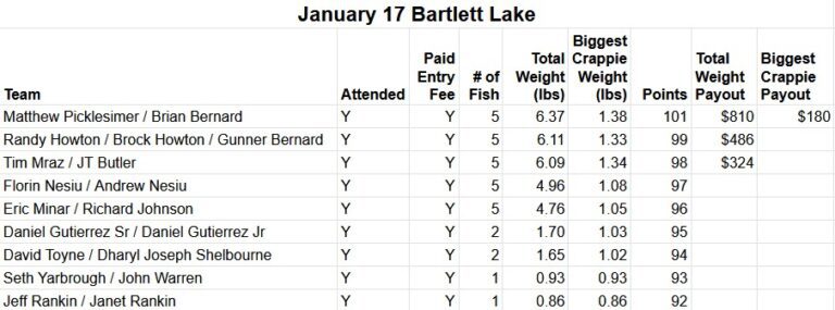 This Arizona Division tournament is led by Randy Howton and Brian Bernard with oversight and help from a committee/board consisting of Randy Howton (tournament director), Brian Bernard (boat/livewell checks), Richard Johnson (weighmaster), Matthew Picklesimer (treasurer), Tim Mraz (record keeper), and Matt Rokusek (website, social media).