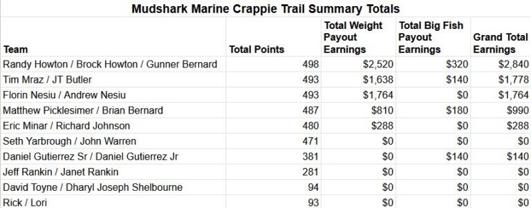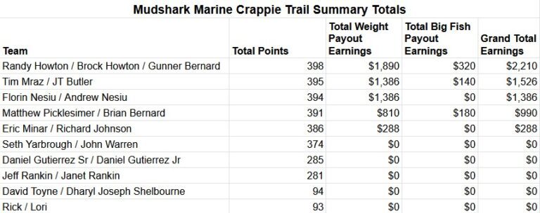 Follow the Mudshark Marine Crappie Tournament Facebook page for updates.